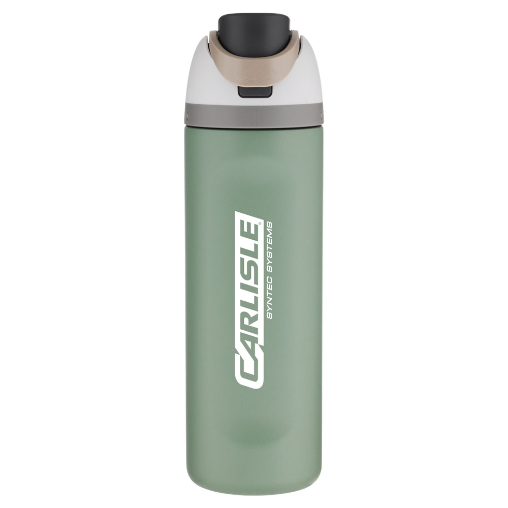 The Owala FreeSip 24 oz thermal bottle delivers flexible, on-the-go hydration. Built from durable 18/8 stainless steel with double wall construction and copper vacuum insulation, it keeps cold beverages chilled for hours. It features a dual-purpose threaded lid with a push-button locking mechanism, offering the option to sip through the built-in straw or tilt back to drink through the wide-mouth opening. Finished with a durable powder coated exterior for a secure, stylish grip. Do not microwave. Hand wash recommended. 10.6" H x 3" W